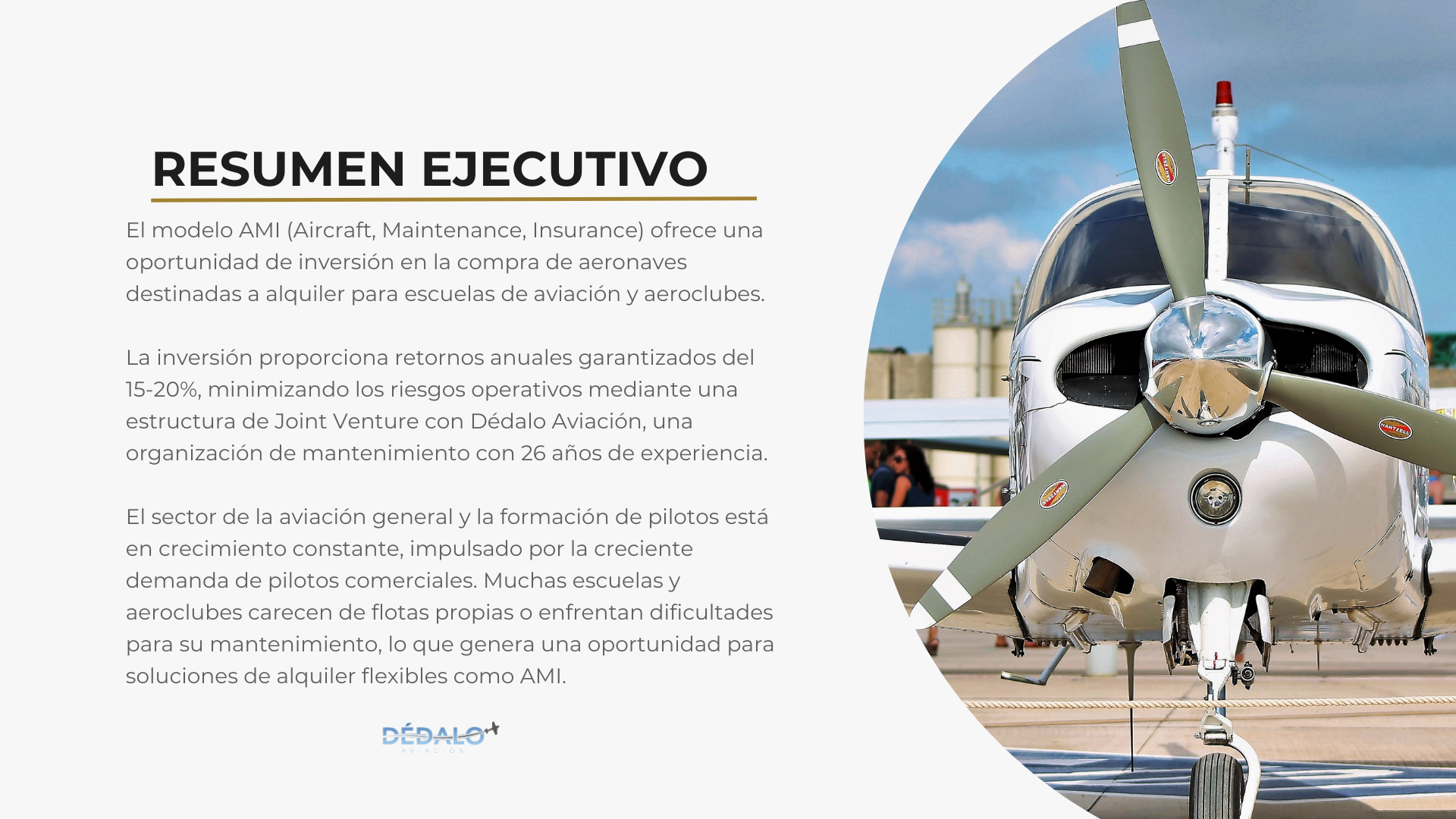 Fly-Solutions es un proyecto de inversión para la adquisición de aeronaves cuya finalidad es la explotación mediante el modelo AMI. Aircraft, Maintenance, Insurance. El cliente potencial son escuelas de aviación o aeroclubs. El retorno esperado del proyecto se evalúa en torno al 15-20%.